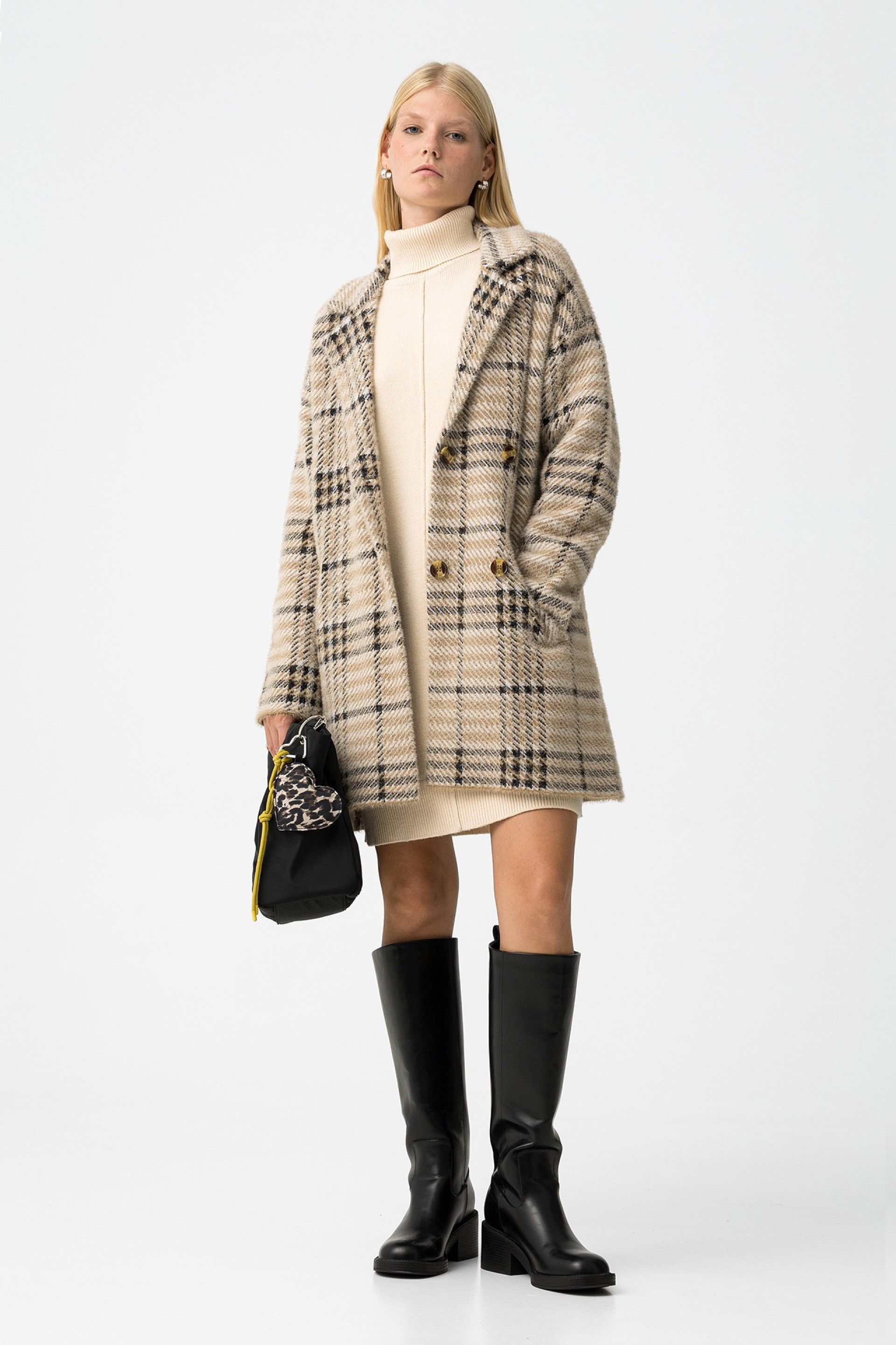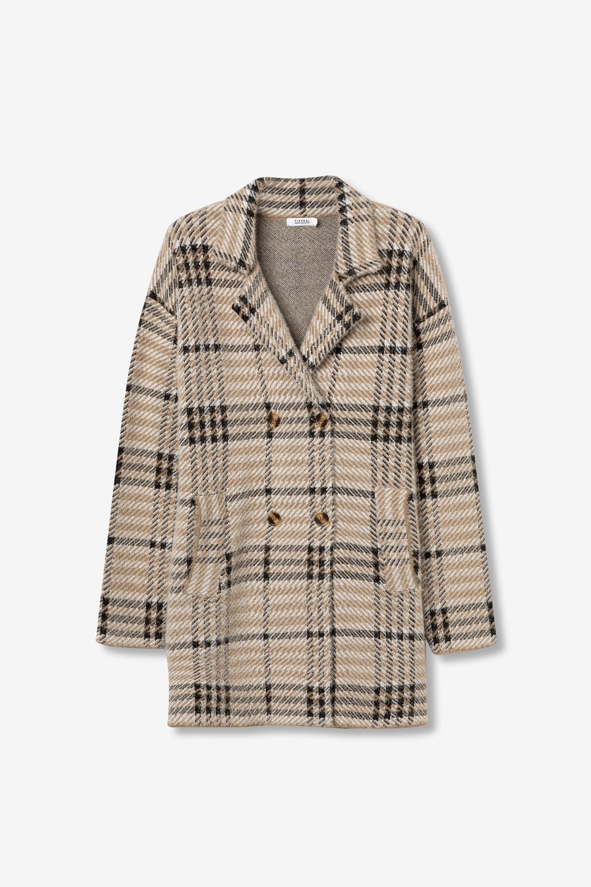 Cárdigan relaxed fit de punto suave con estampado de cuadros y doble cruce. Solapa de muesca, manga larga, cierre de botones y dos bolsillos frontales.