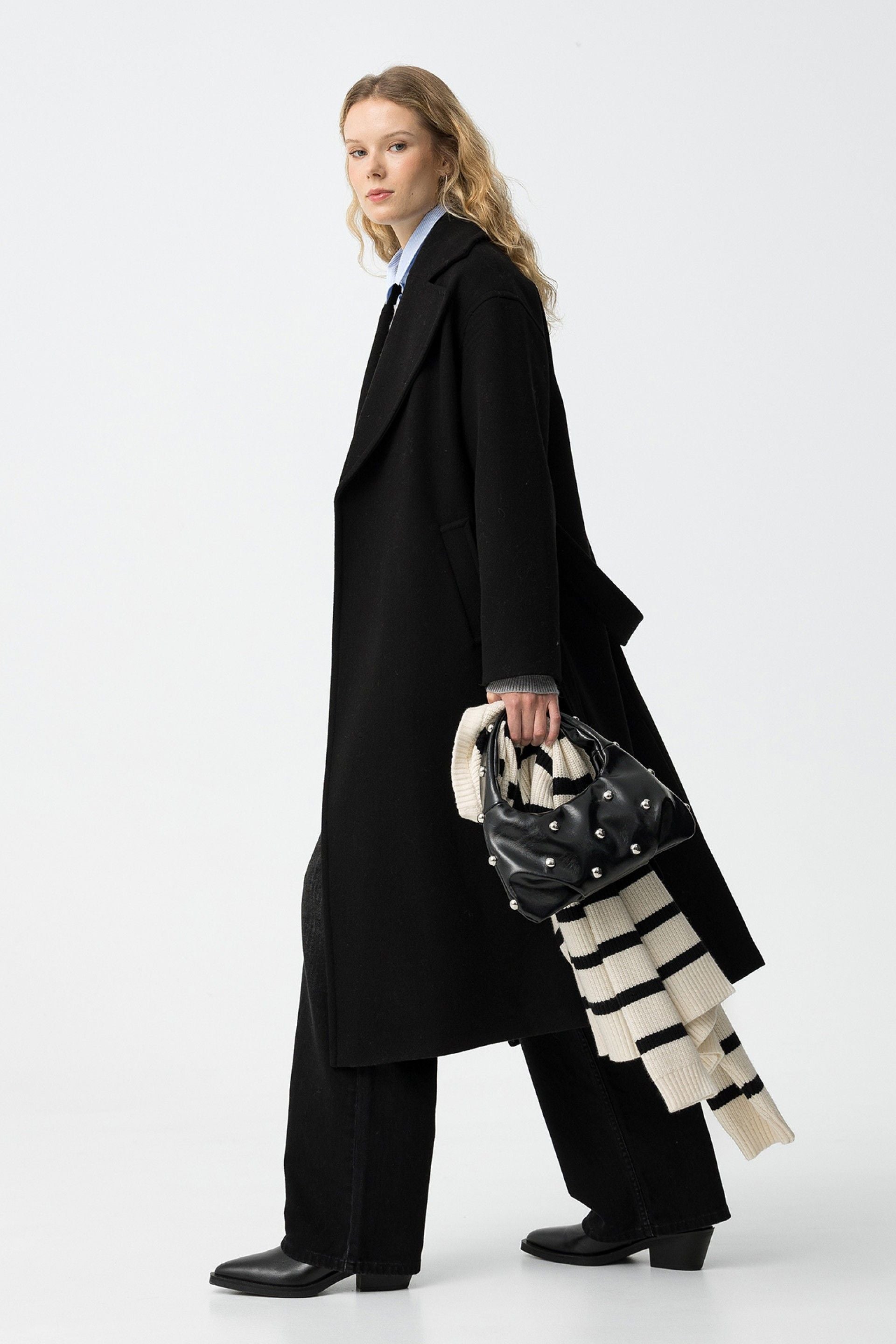 Abrigo relaxed fit con cuello de solapa y manga larga. Bolsillos laterales de vivo. Cinturón ajustable del mismo tejido. Interior forrado.
