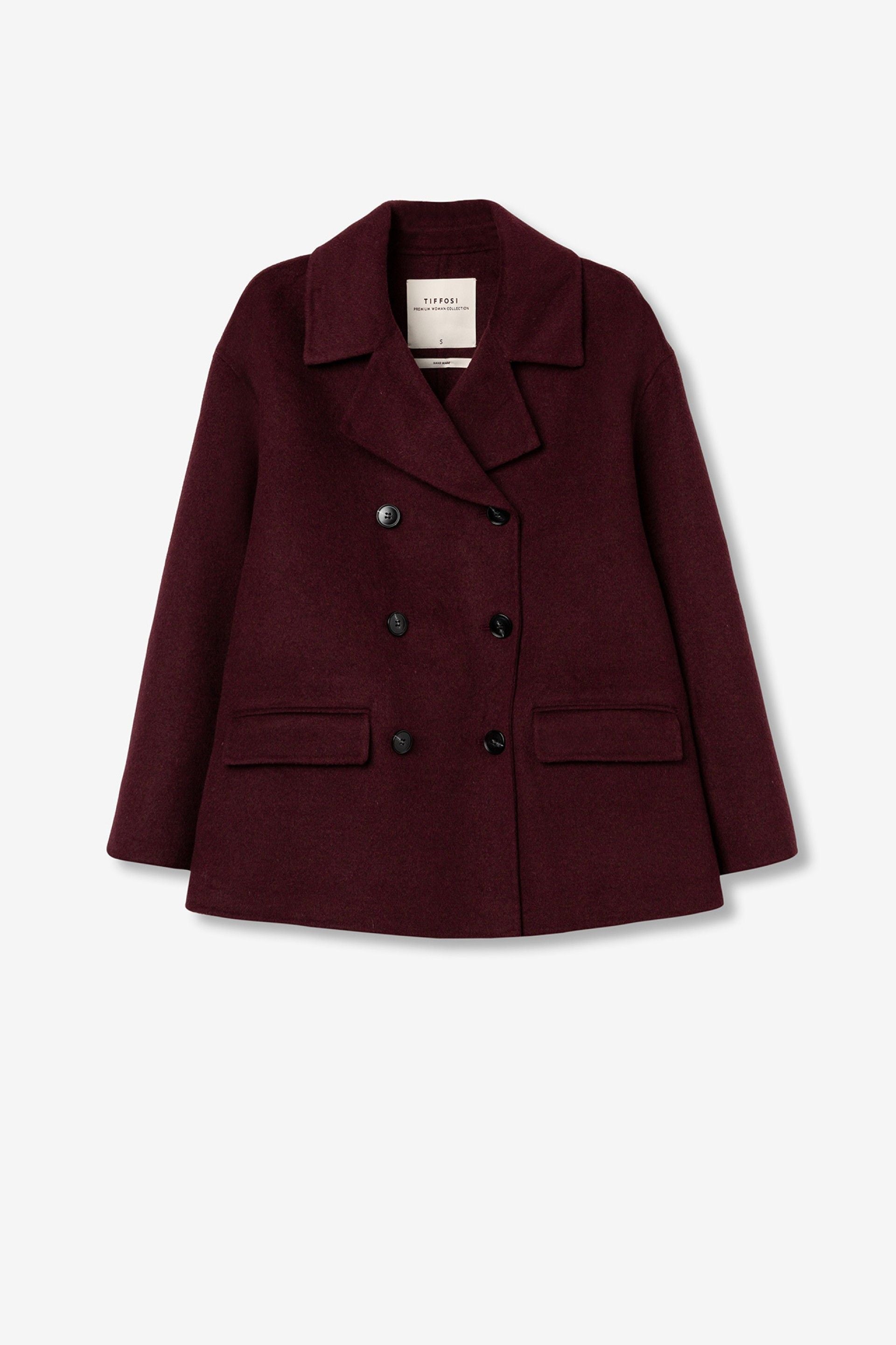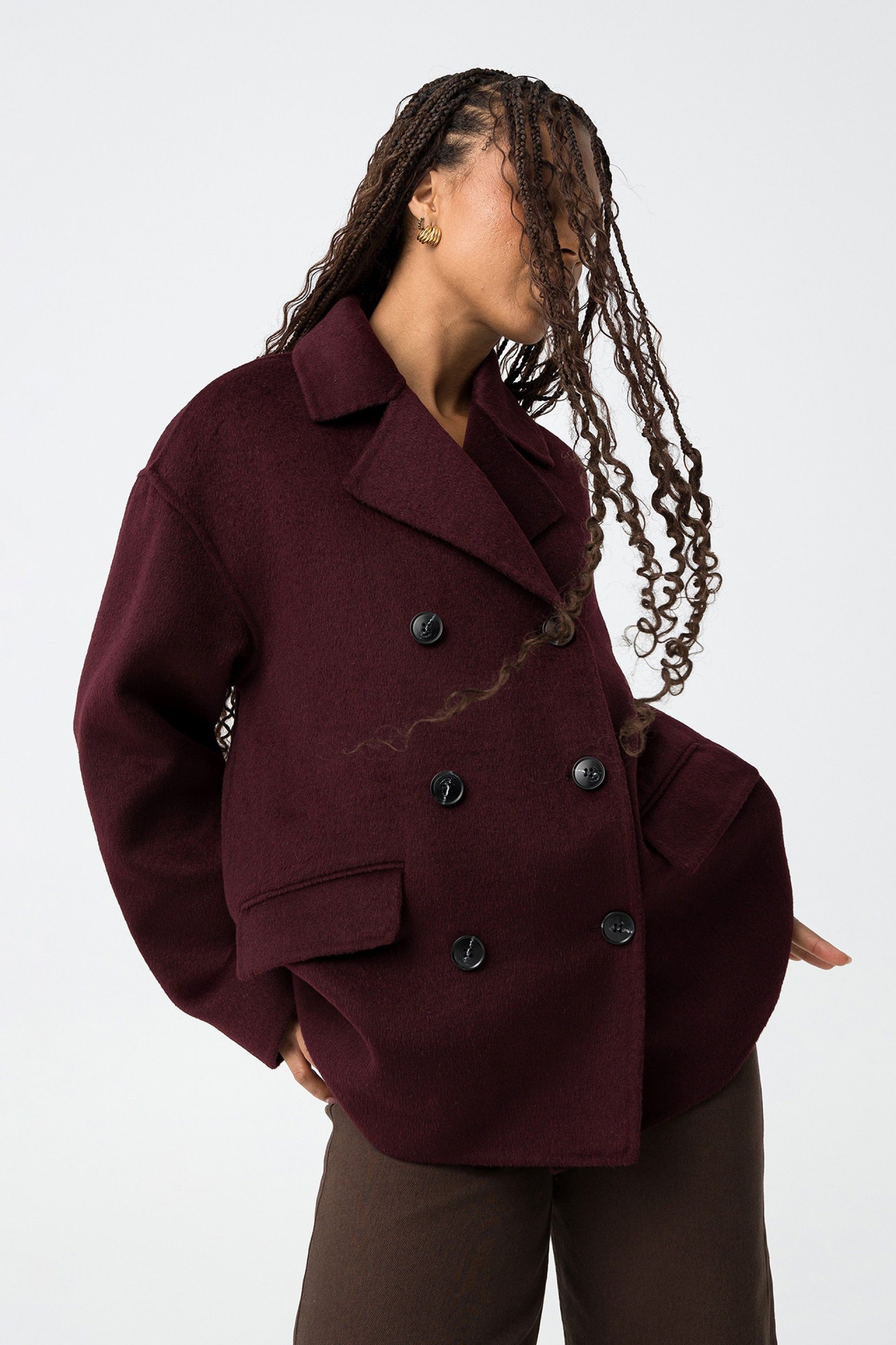 Chaqueta corta con doble botonadura y cuello de solapa. Mezcla de fibras (incluye lana). Bolsillos de solapa frontales. Corte recto.
