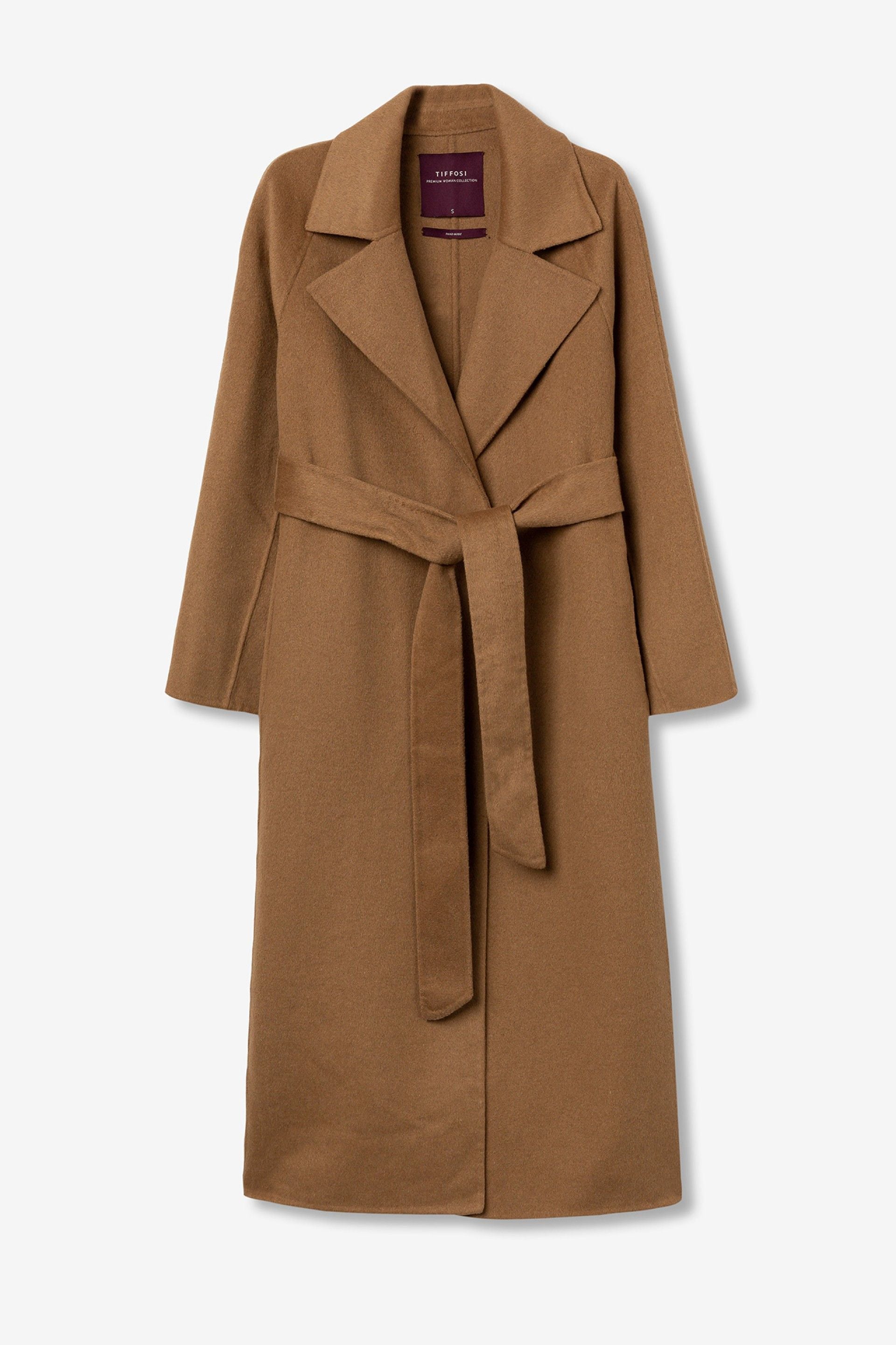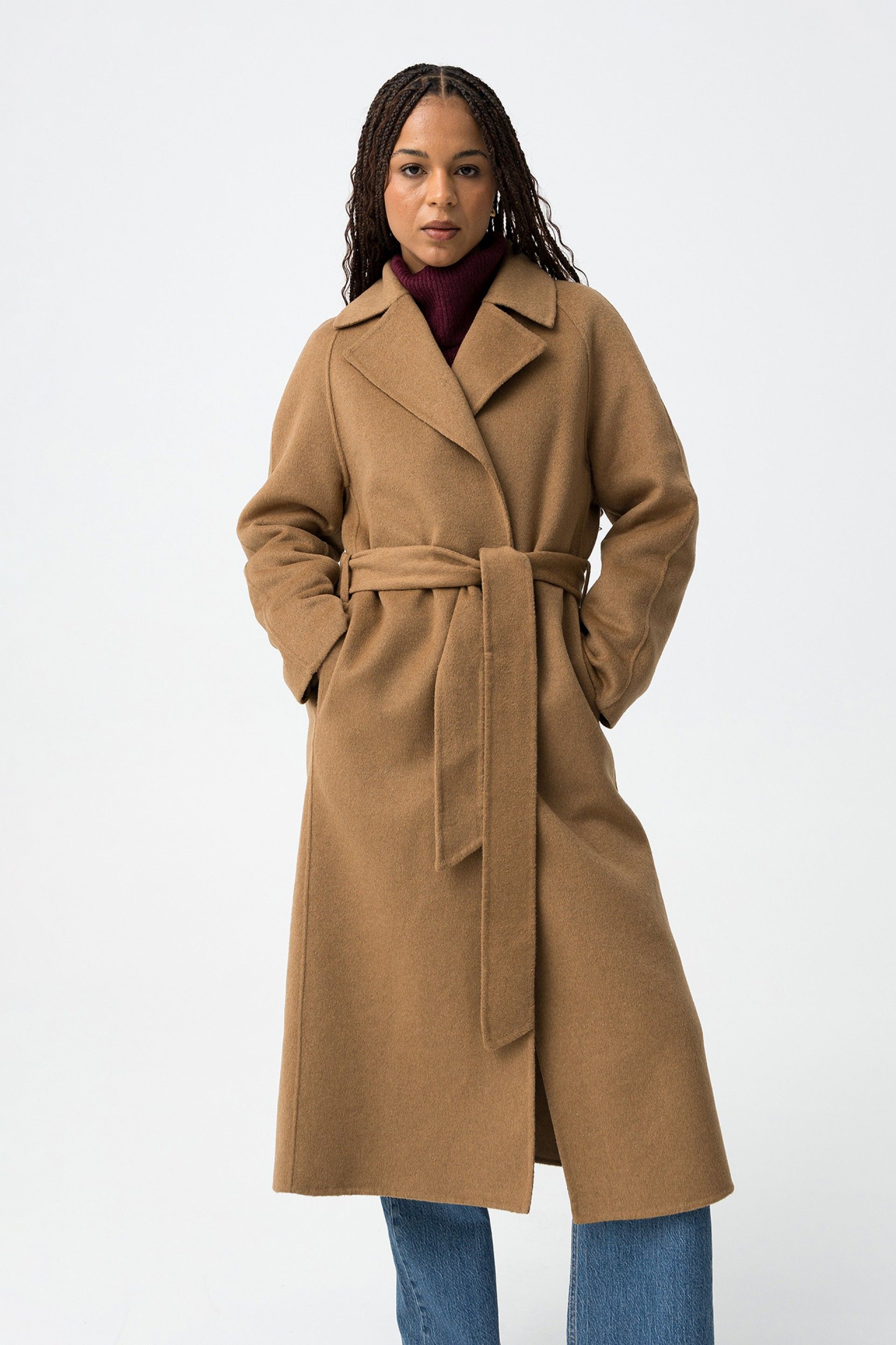 Abrigo con cuello de solapa y cinturón del mismo tejido para ajustar. Con mezcla de fibras que incluye lana, para mayor confort térmico. Corte recto y sin cierre visible.