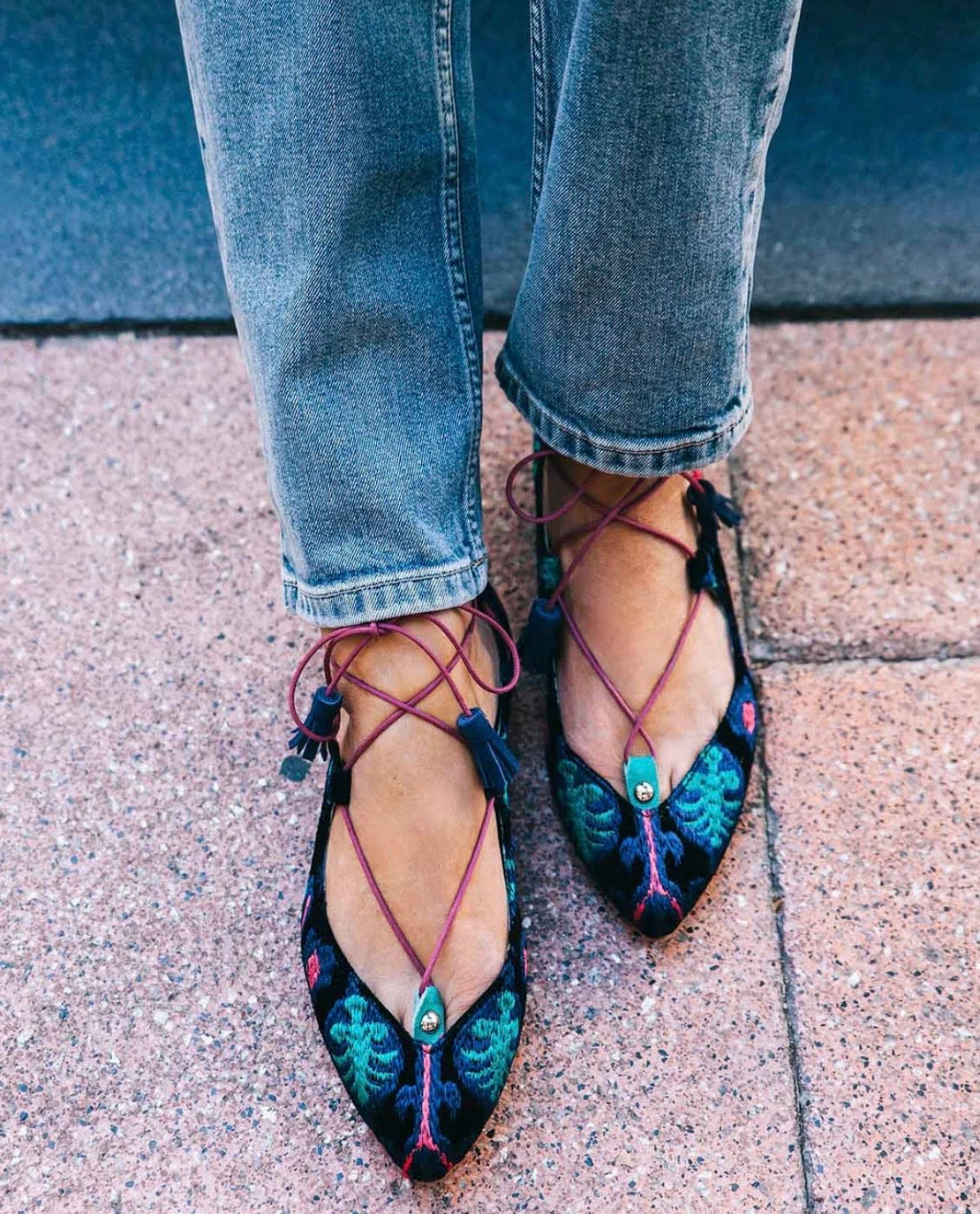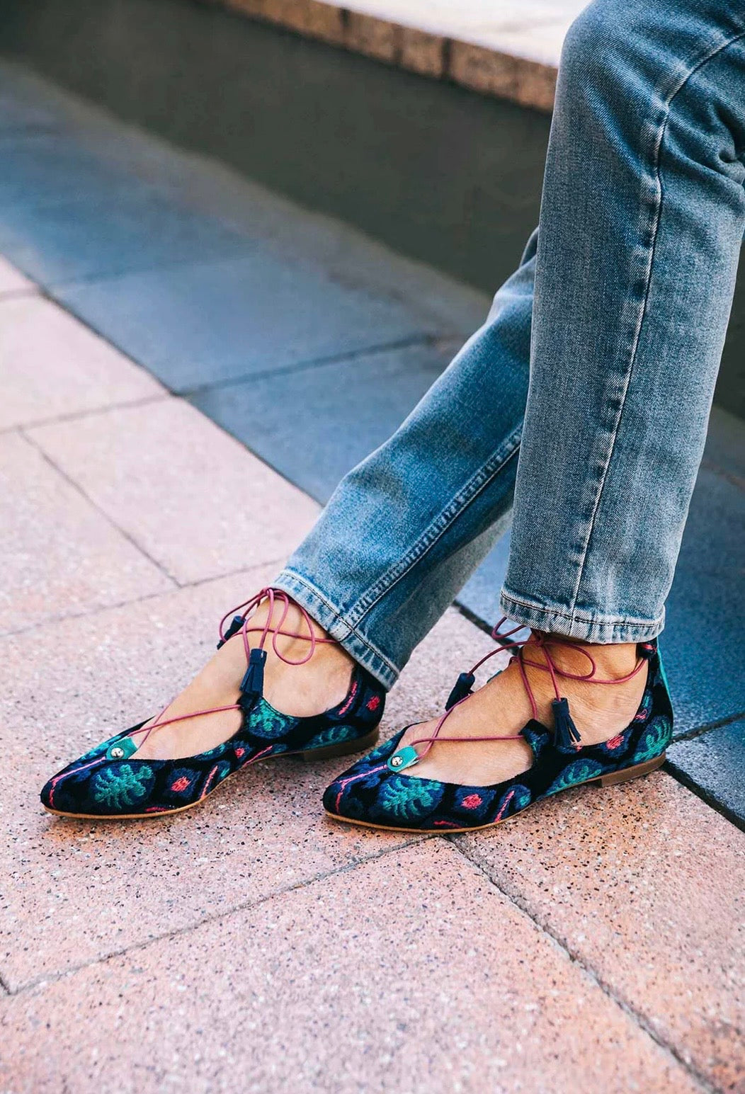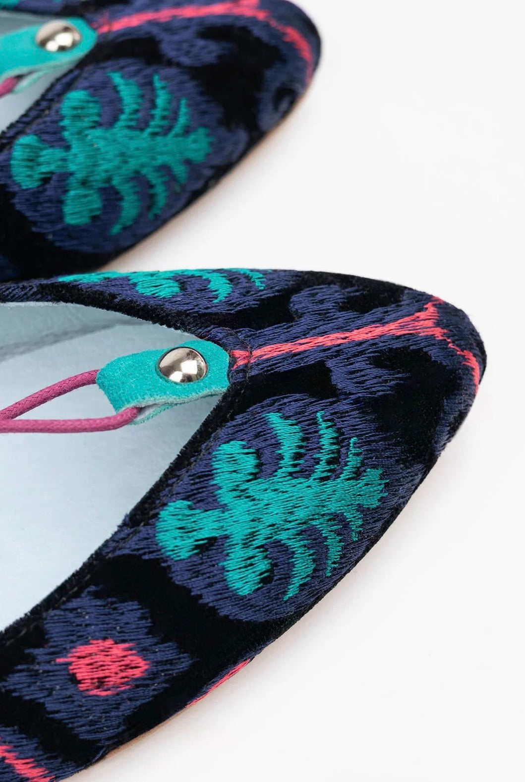 Bailarinas anudadas al tobillo con tejido de terciopelo de seda negro, bordado en rosa, morado y verde agua. Un diseño súper especial con aires étnicos que confiere un estilo muy personal al look. Se anudan con cordones de algodón rosa, rematados con borlas de ante morado. La trasera lleva una llamativa tira de ante verde en contraste.