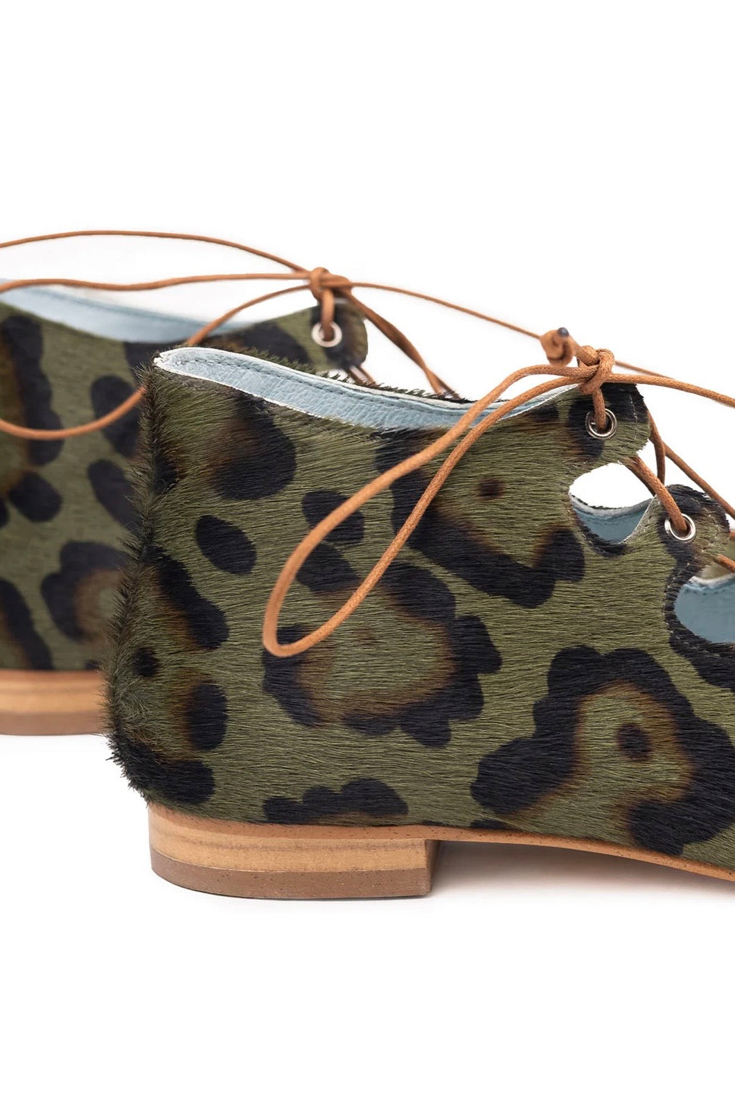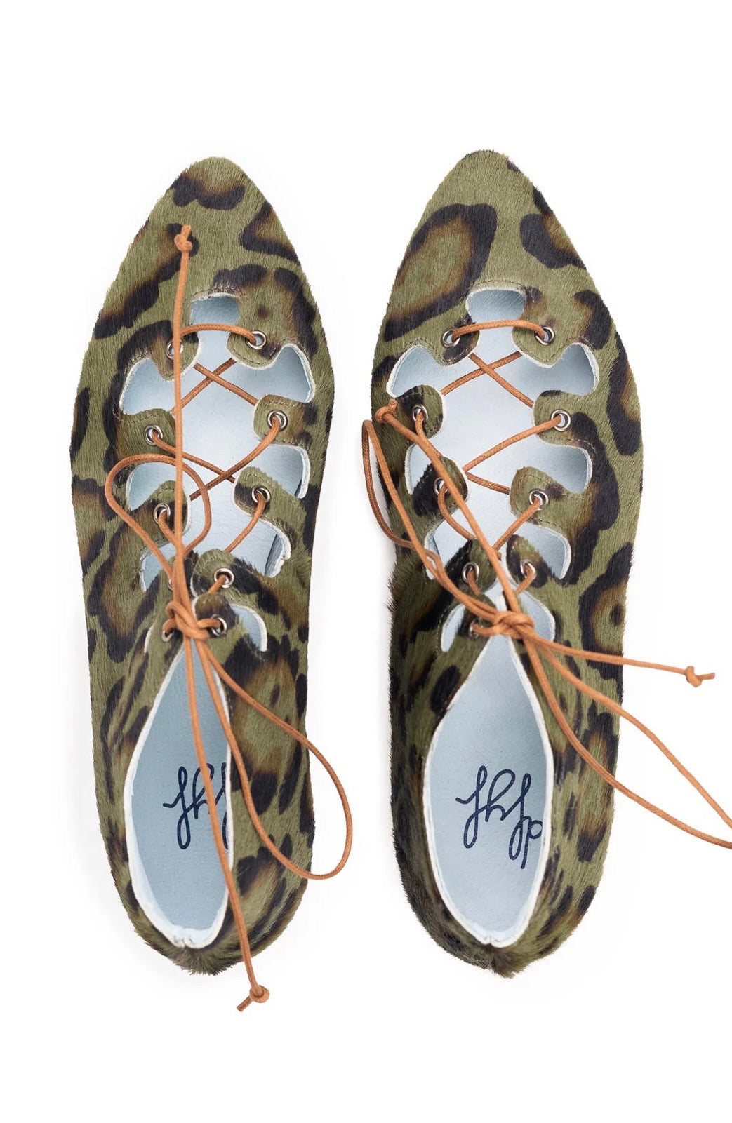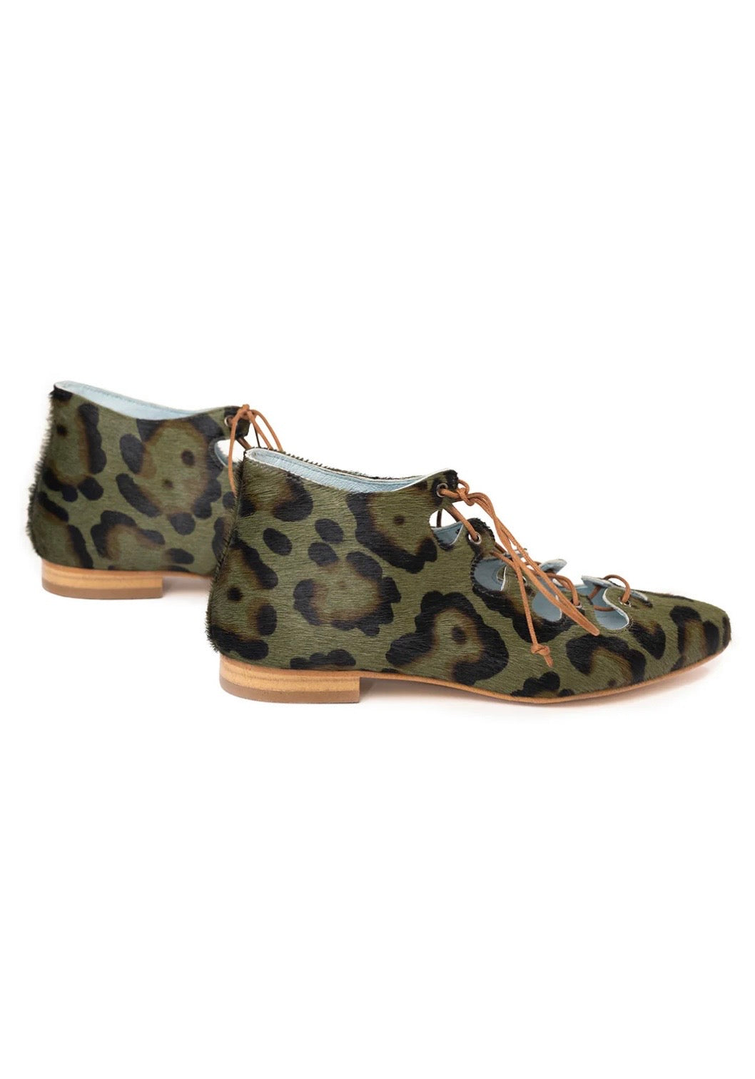 Berlin Caza es un modelo semi-botín que hará las delicias de las amantes del print caza. Destaca por su abertura escotada, con diversas ondas, con cierre de cordones a contraste y una punta afilada, que estiliza la pierna. Están elaborados en piel de pony verde caza con manchas marrones que dibujan un elegante animal print.