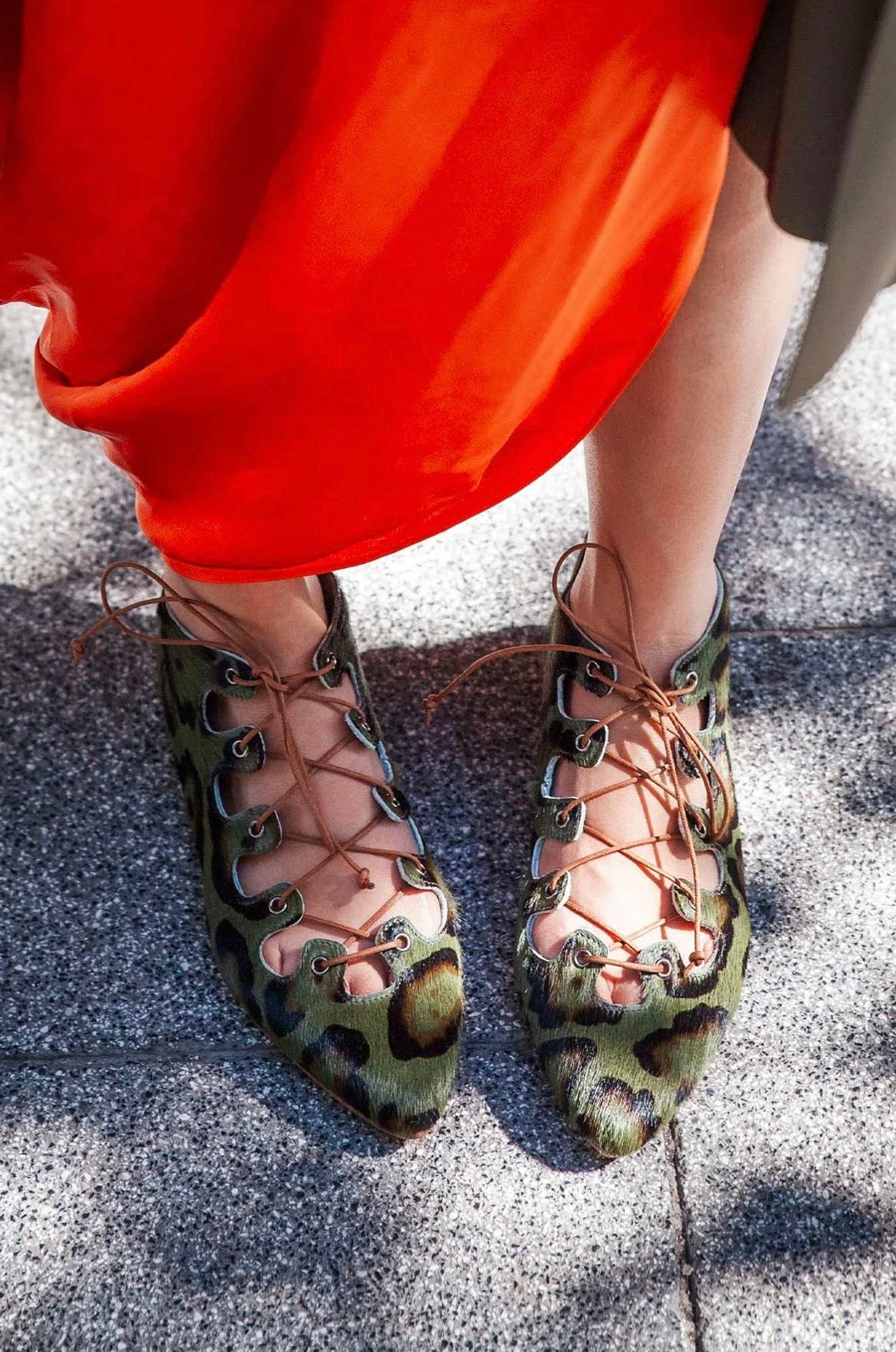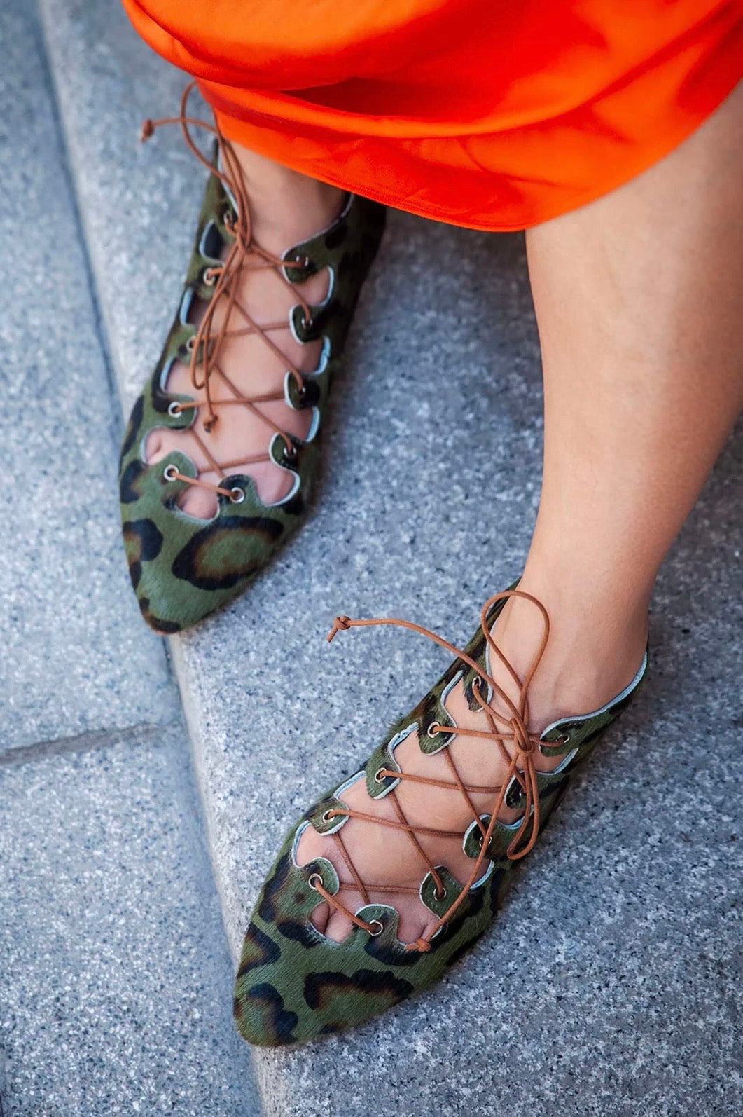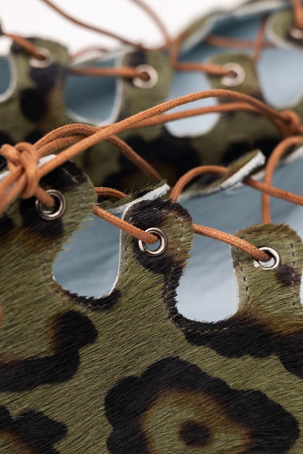 Berlin Caza es un modelo semi-botín que hará las delicias de las amantes del print caza. Destaca por su abertura escotada, con diversas ondas, con cierre de cordones a contraste y una punta afilada, que estiliza la pierna. Están elaborados en piel de pony verde caza con manchas marrones que dibujan un elegante animal print.
