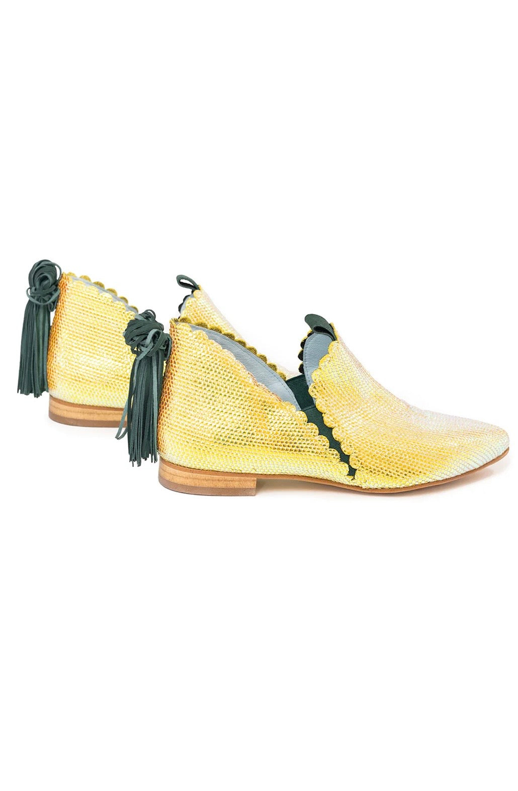 Ginebra Tostado es un botín de piel tornasolada en un tono brillante con reflejos verdes. Se divide en dos piezas: delantera y trasera, ambas con troquel, y en su unión tiene una separación que marca las aberturas aberturas laterales que le confieren un diseño muy especial. Tiene ajuste con gomas y un detalle que las hace auténticas: un borlón trasero de ante en verde botella.
