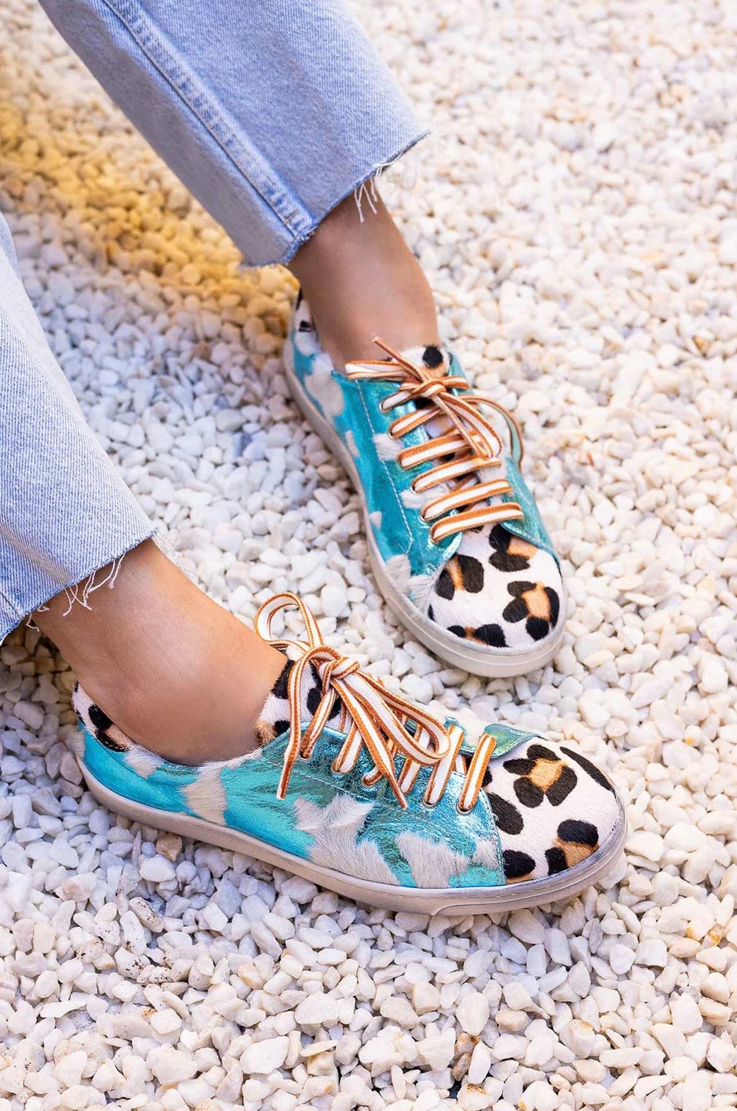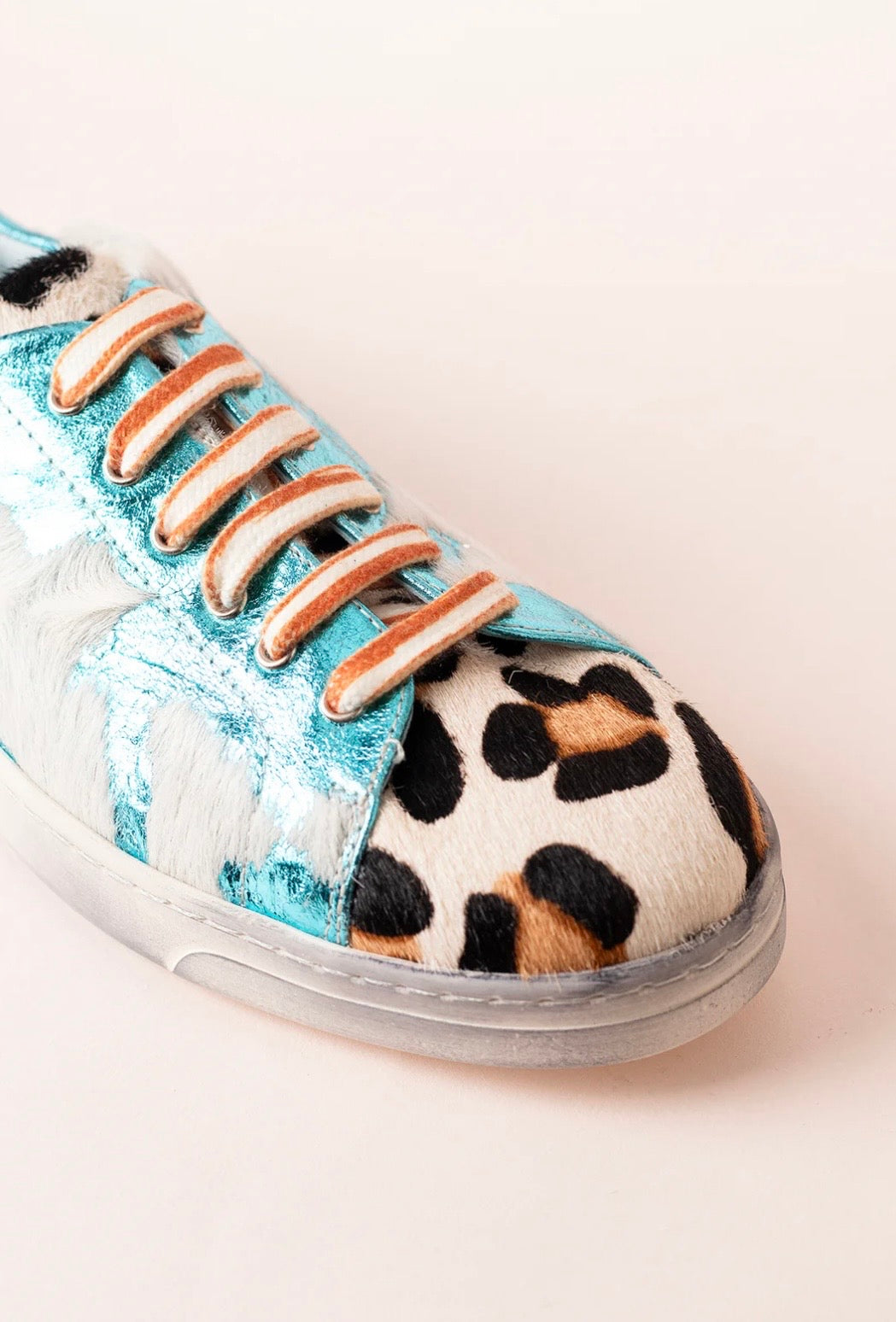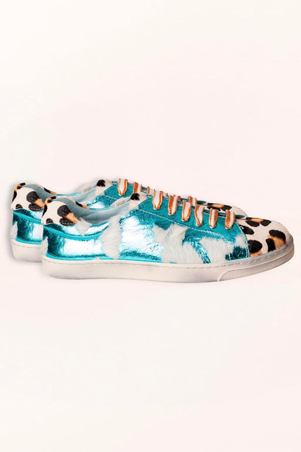 Zapatillas de piel metalizada con estampado animal print pintado a mano en la puntera y la talonera. Interior de piel. Diseño original y producción artesanal. Hechas 100% en España, con materias primas de alta calidad, seleccionadas al detalle.