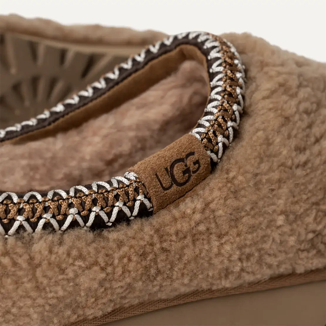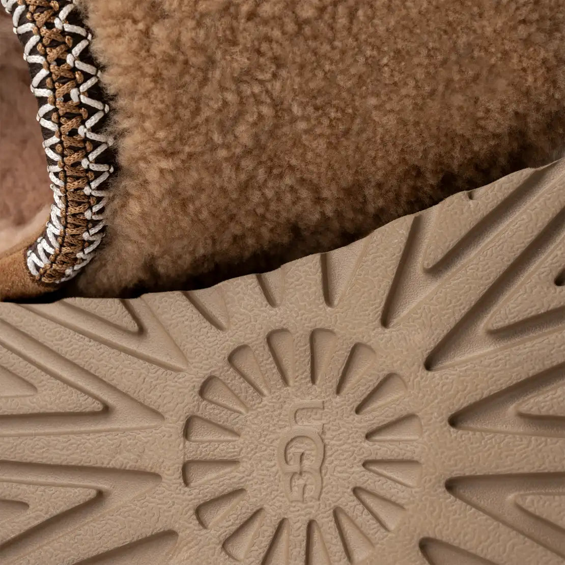 - Motivo trenzado UGGbraid hecho con fibras de poliéster 100 % reciclado, empeine de piel de oveja rizada de 10 mm