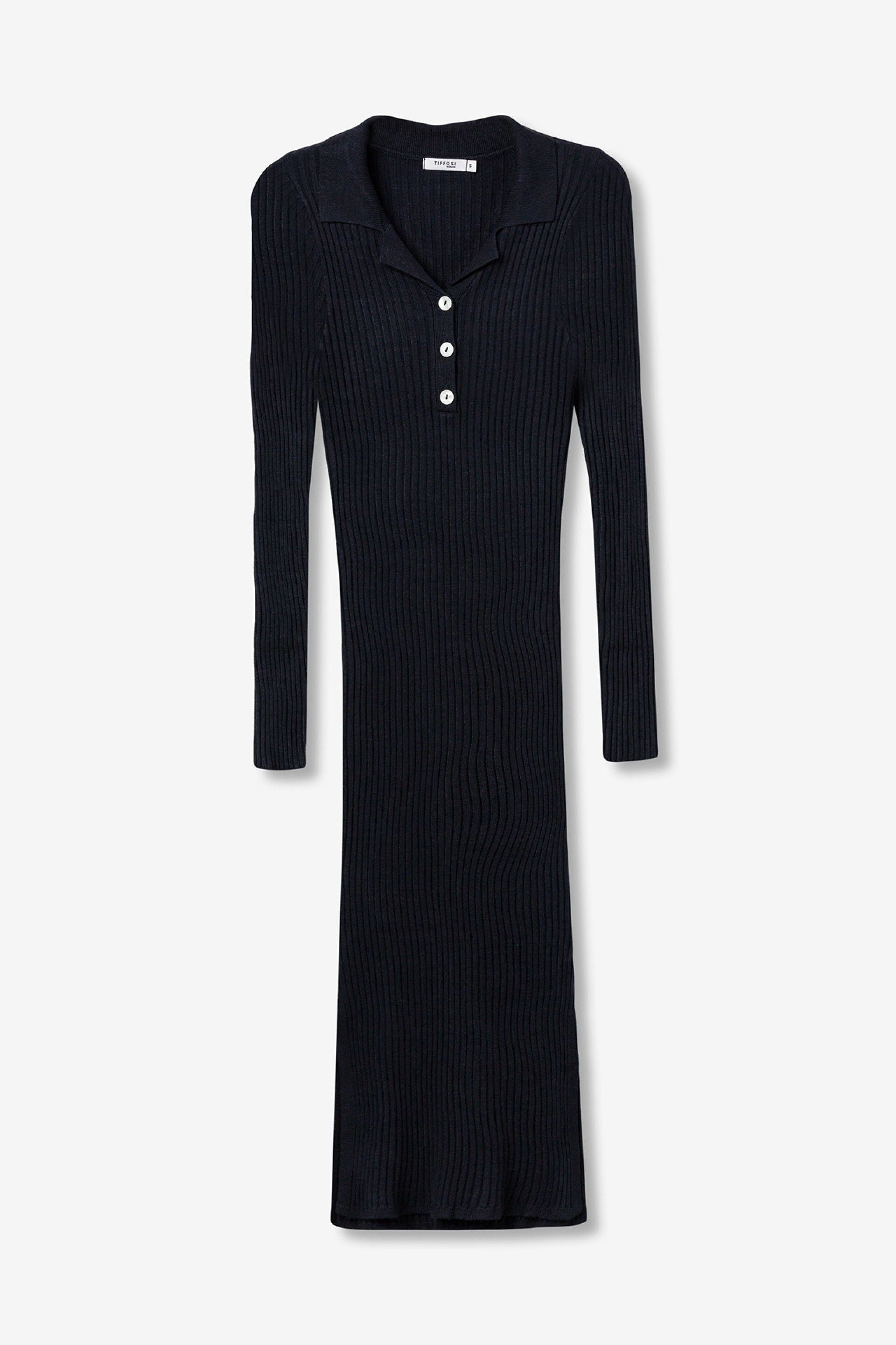 Vestido midi super slim fit de punto canalé, cierre frontal de botones, cuello camisero y manga larga.