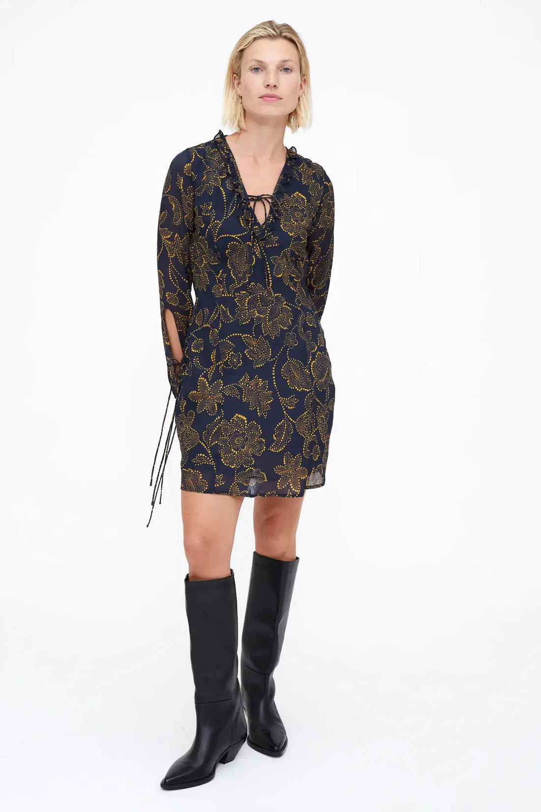 Vestido corto estampado Mustard Flower. Cuello pico anudado con volantes.Manga larga con abertura lateral y detalles anudados en los puños. Forro interior.