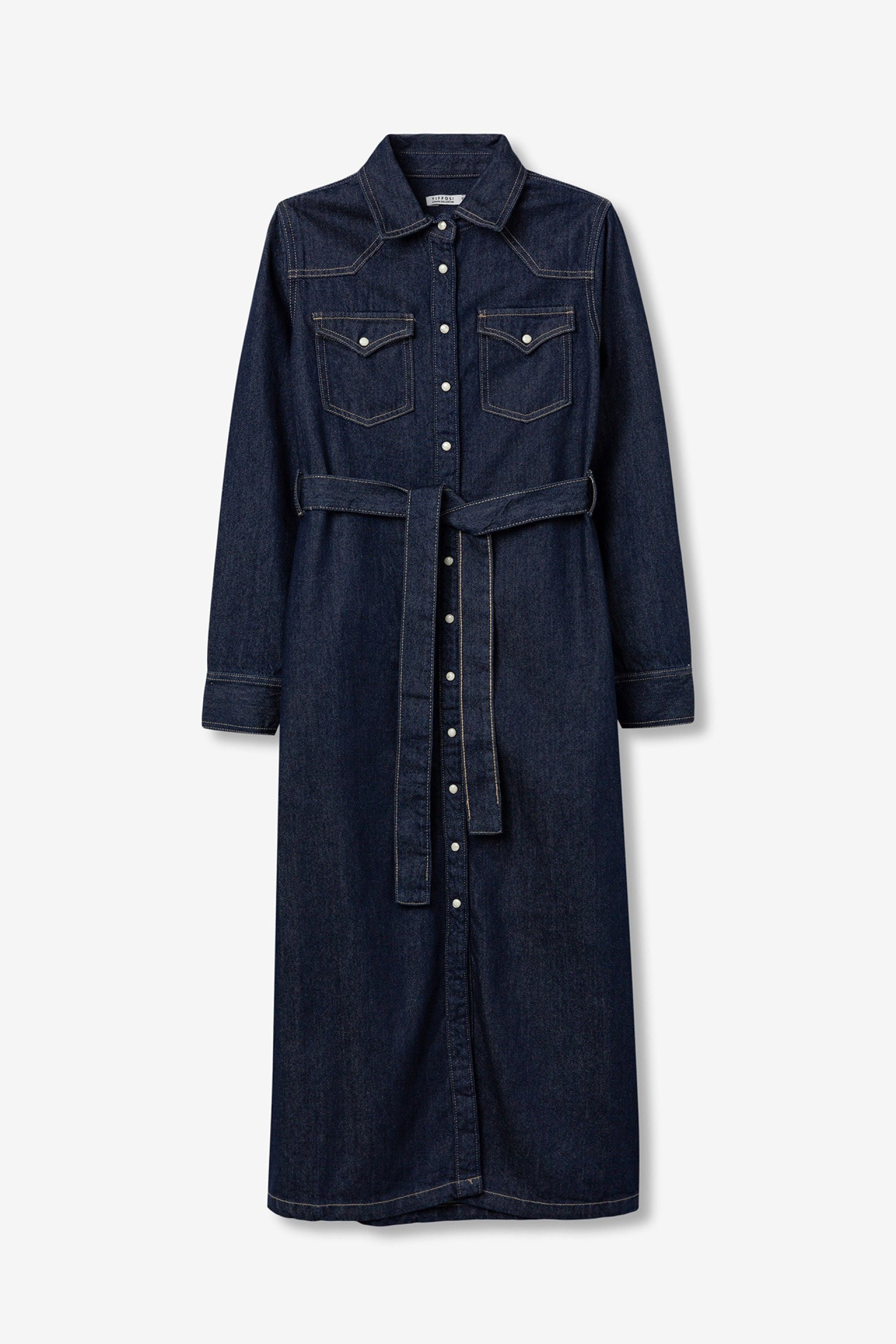 Vestido camisero regular fit en tejido denim. Cuello de solapa con manga larga y puño con botón. Bolsillos frontales de solapa con botón de presión. Costuras destacadas. Cinturón ajustable del mismo tejido.