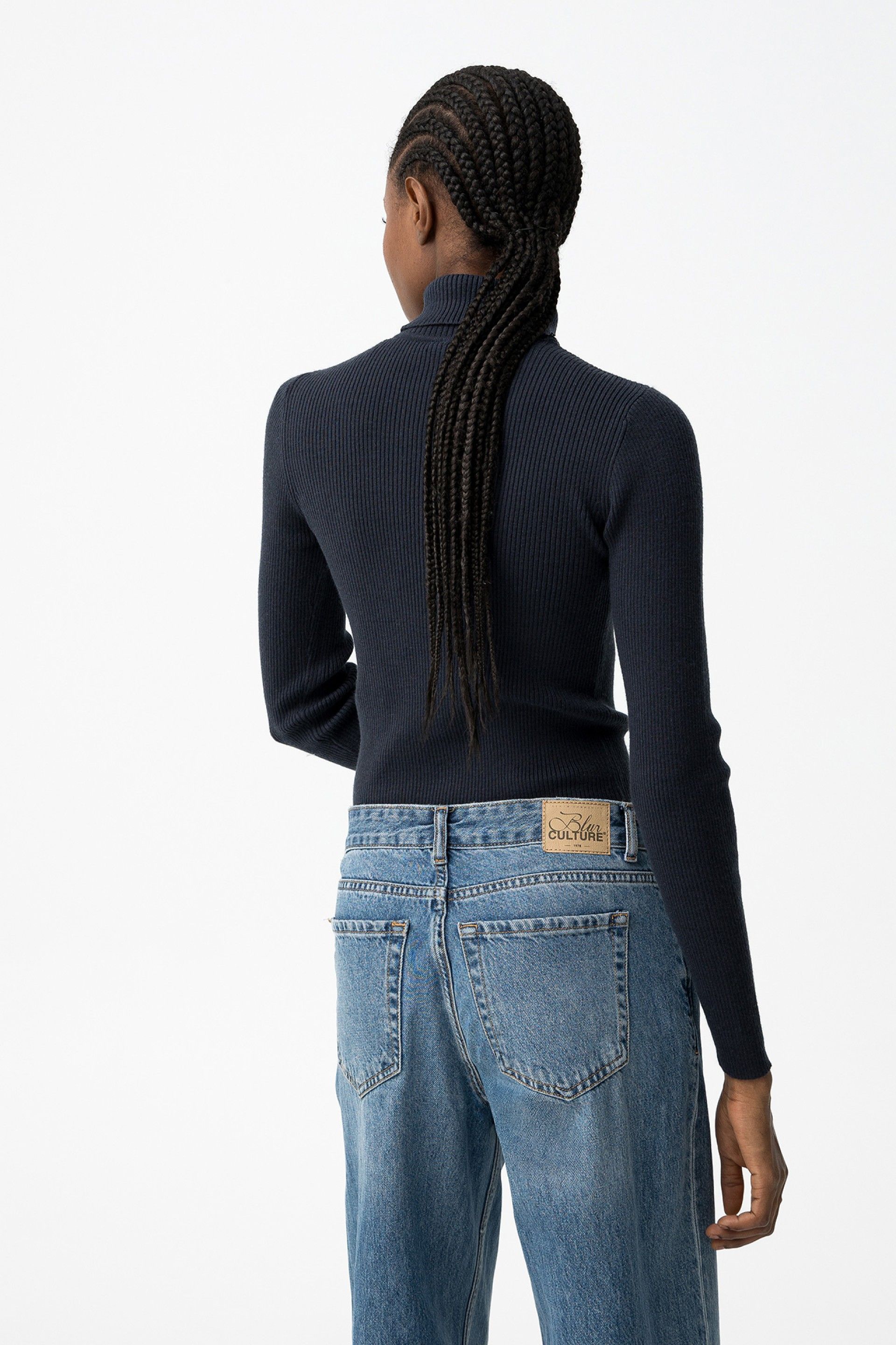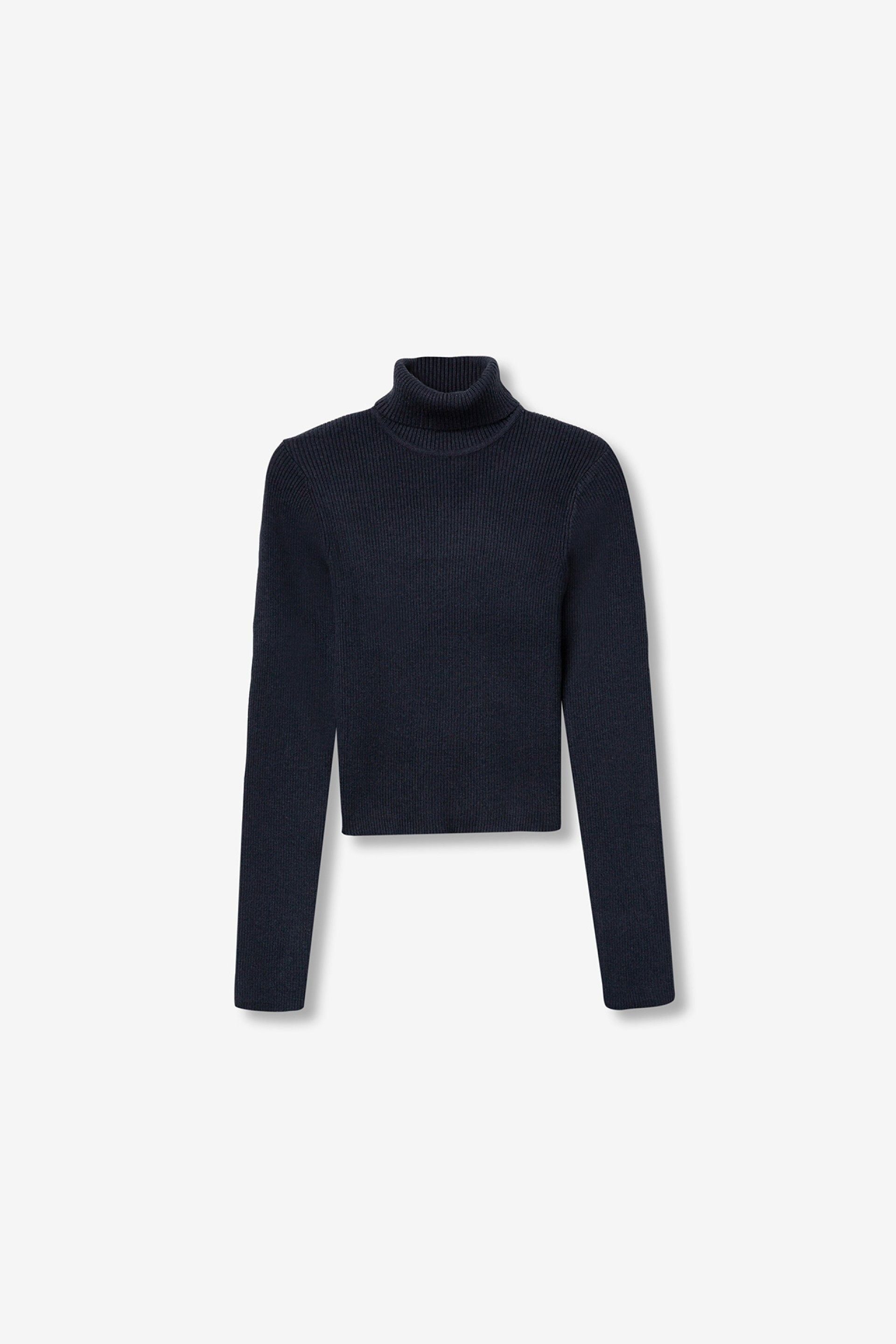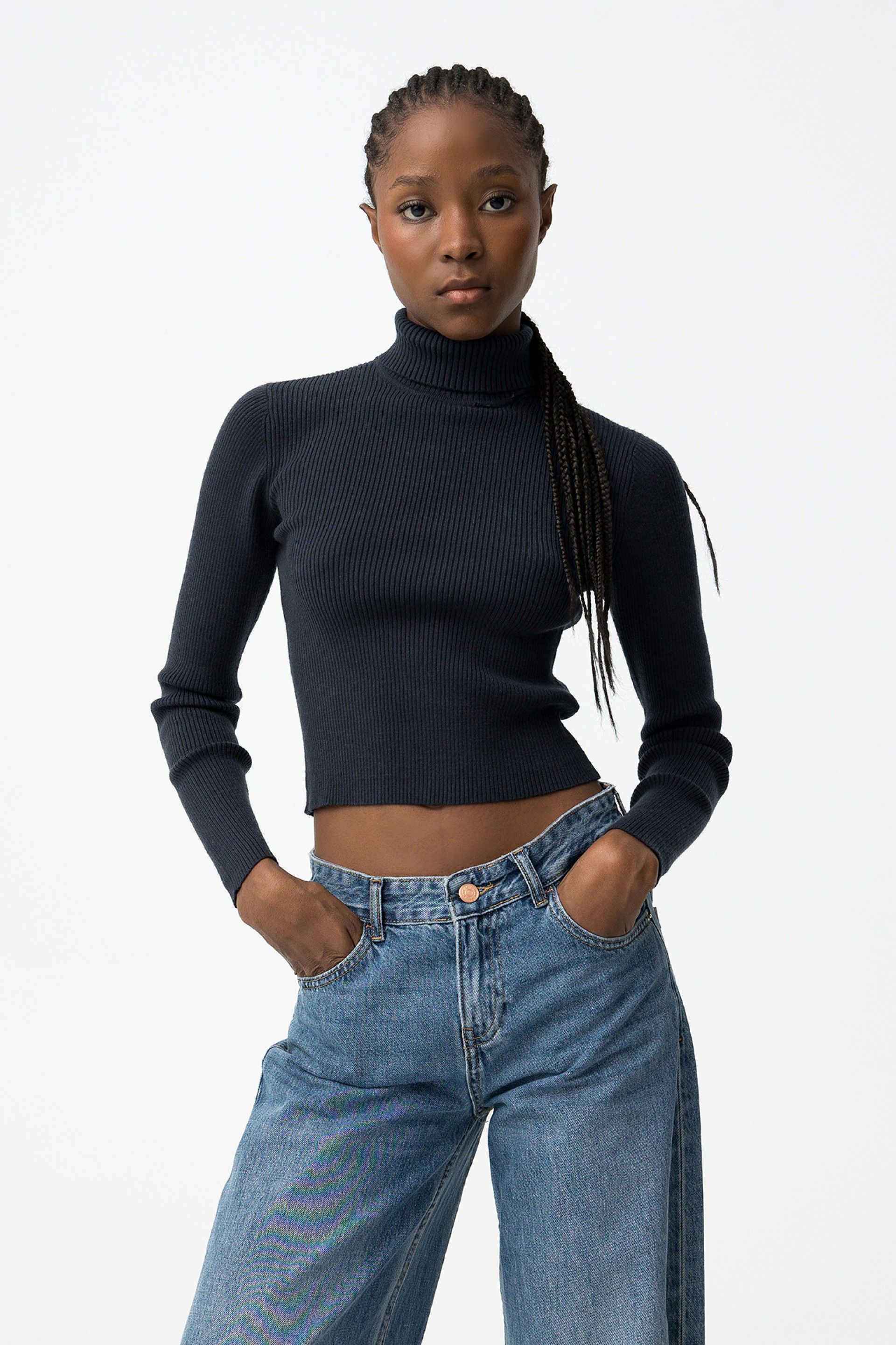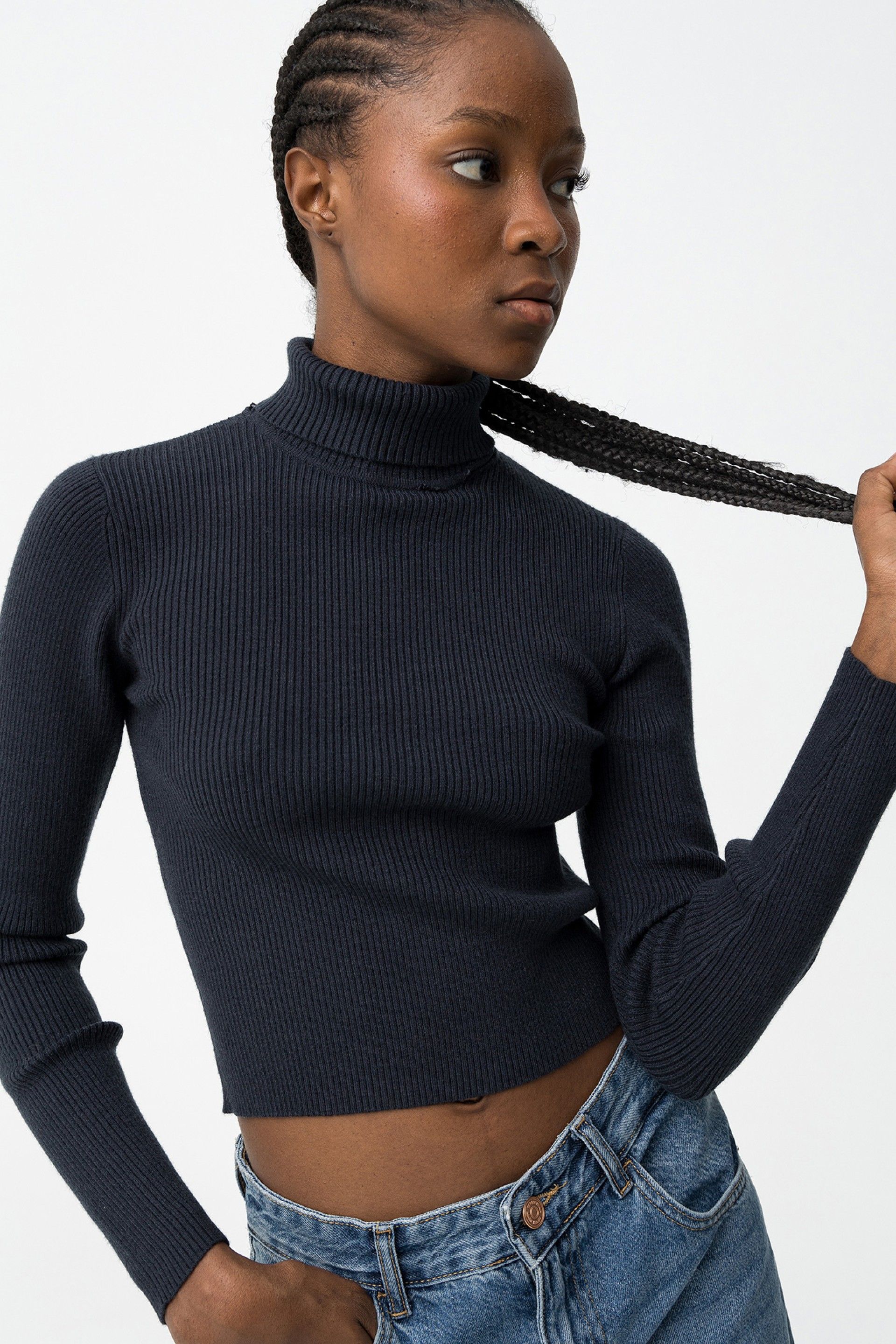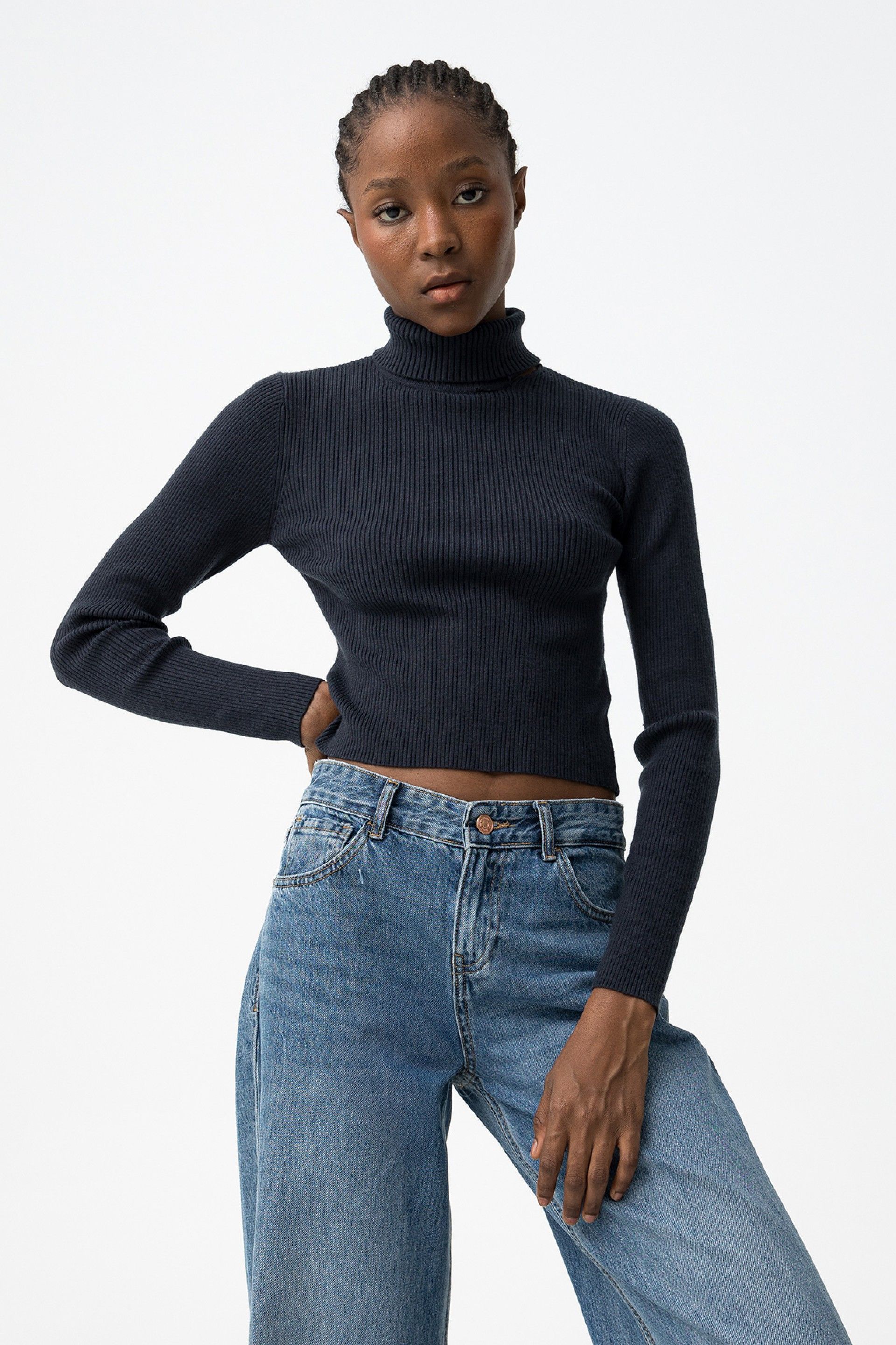 Jersey de manga larga en punto canalé. Super slim fit y cropped. Cuello alto. Puños y bajo en rib.
